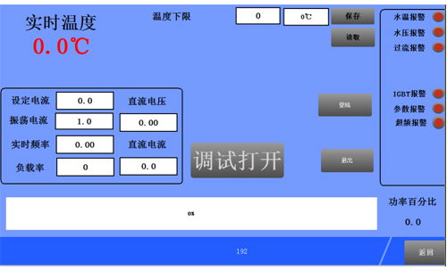 本电源有负载自适应功能,在不上主电状态下,调整好负载之后,在电源内控模式下加热,上位显示屏自动给出负载的匹配状态及谐振频率供用户参考调试。